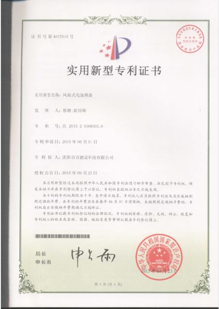 實用新型:風(fēng)扇式電加熱器專利303.9片